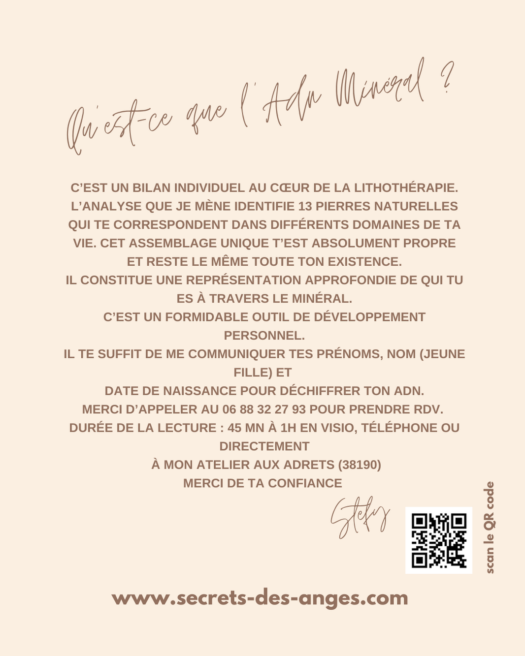 🌀 Et parce que je crois profondément que les pierres peuvent nous accompagner sur notre chemin de vie, j’ai me suis formée à l’ADN Minéral : une consultation personnalisée pour découvrir les 13 pierres qui te correspondent. Un mix de vibration, d’intuition et de magie 💫