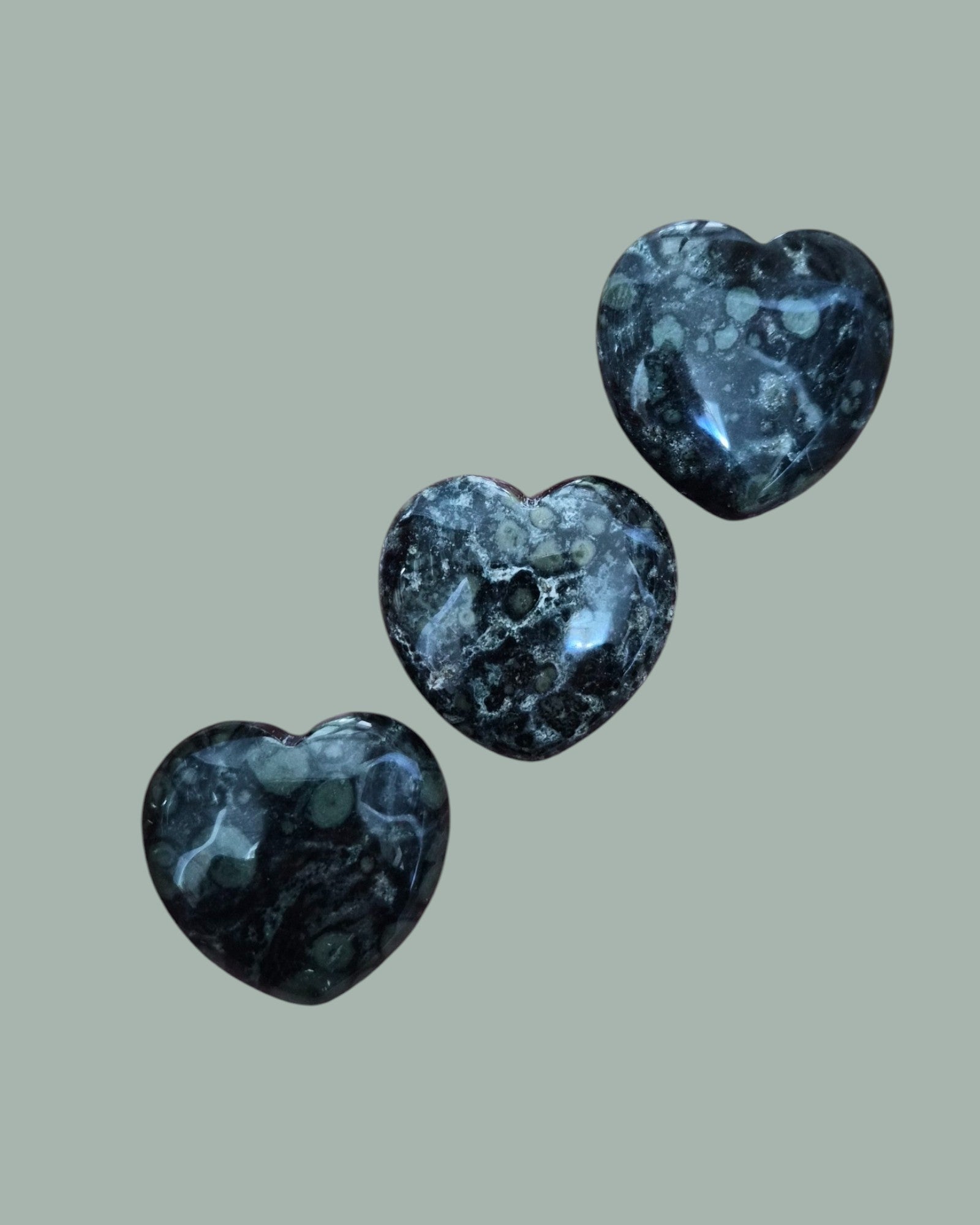 Ce cœur en Jaspe Kambaba est une invitation à revenir à l’essentiel. Sculpté dans une pierre naturelle aux nuances profondes vertes et noires, il symbolise l’équilibre entre force et douceur.