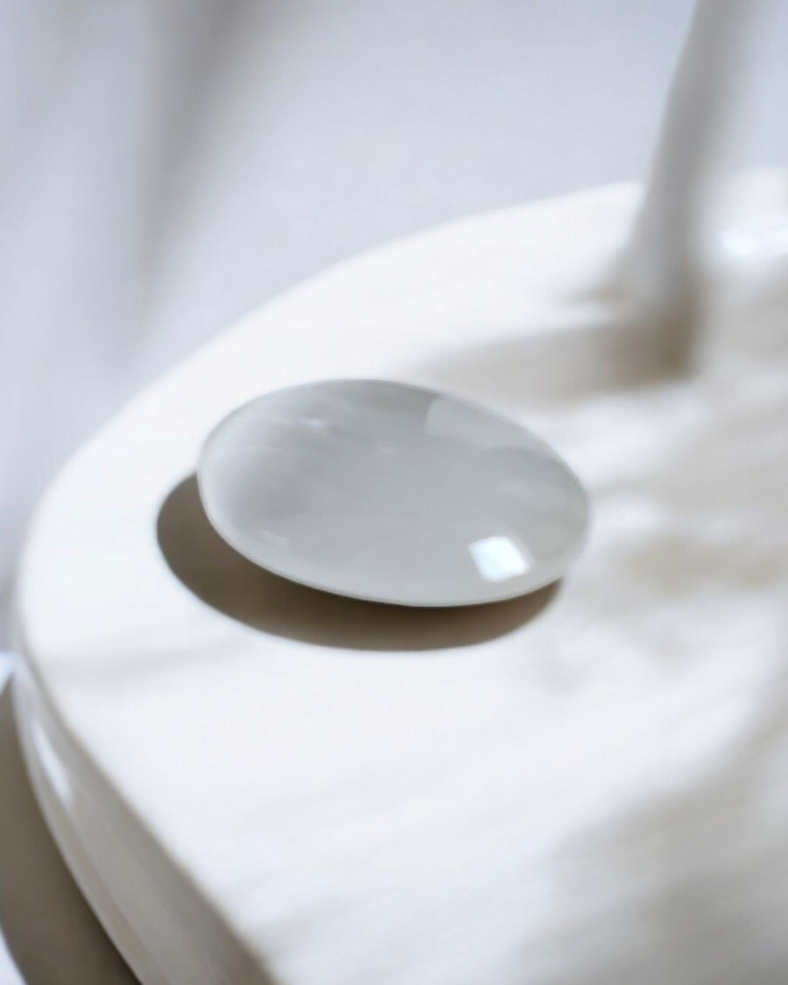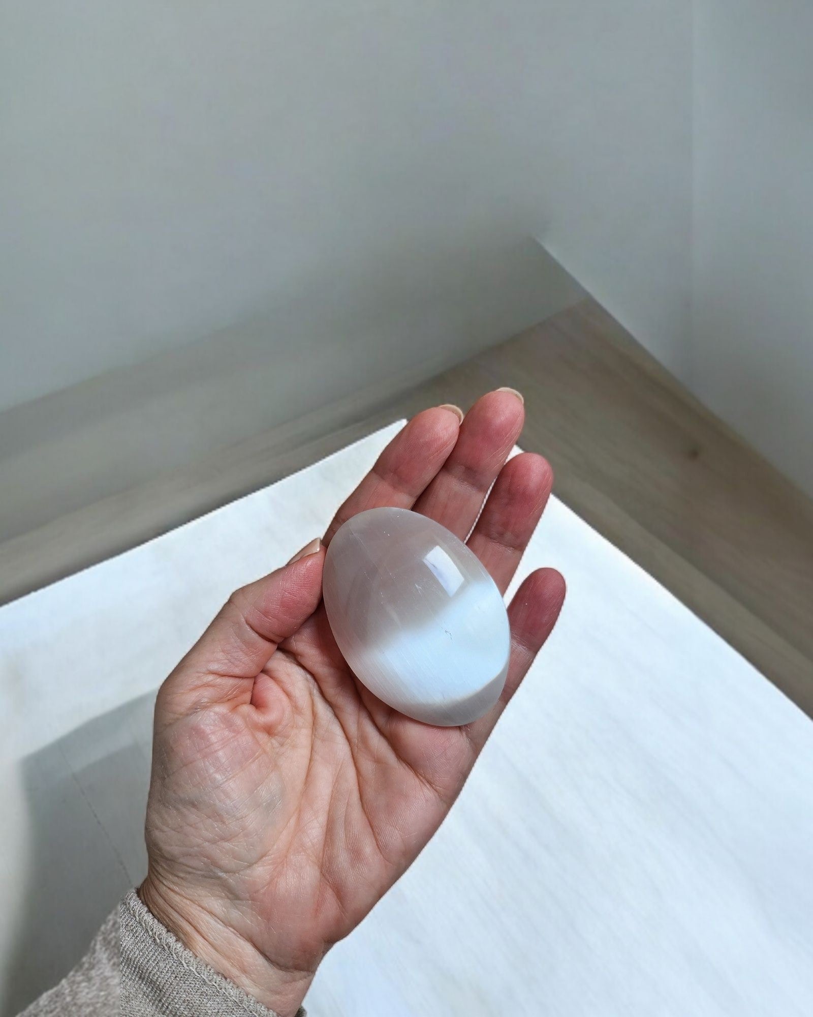 Magnifique galet de Sélénite. Tu peux placer cette pierre dans une de tes poches au quotidien ou bien quand tu en ressens le besoin, en peau à peau sous forme de bijou, en collier, bracelet, charm's, pierre roulée ou sous ton oreiller ou ta table de nuit.