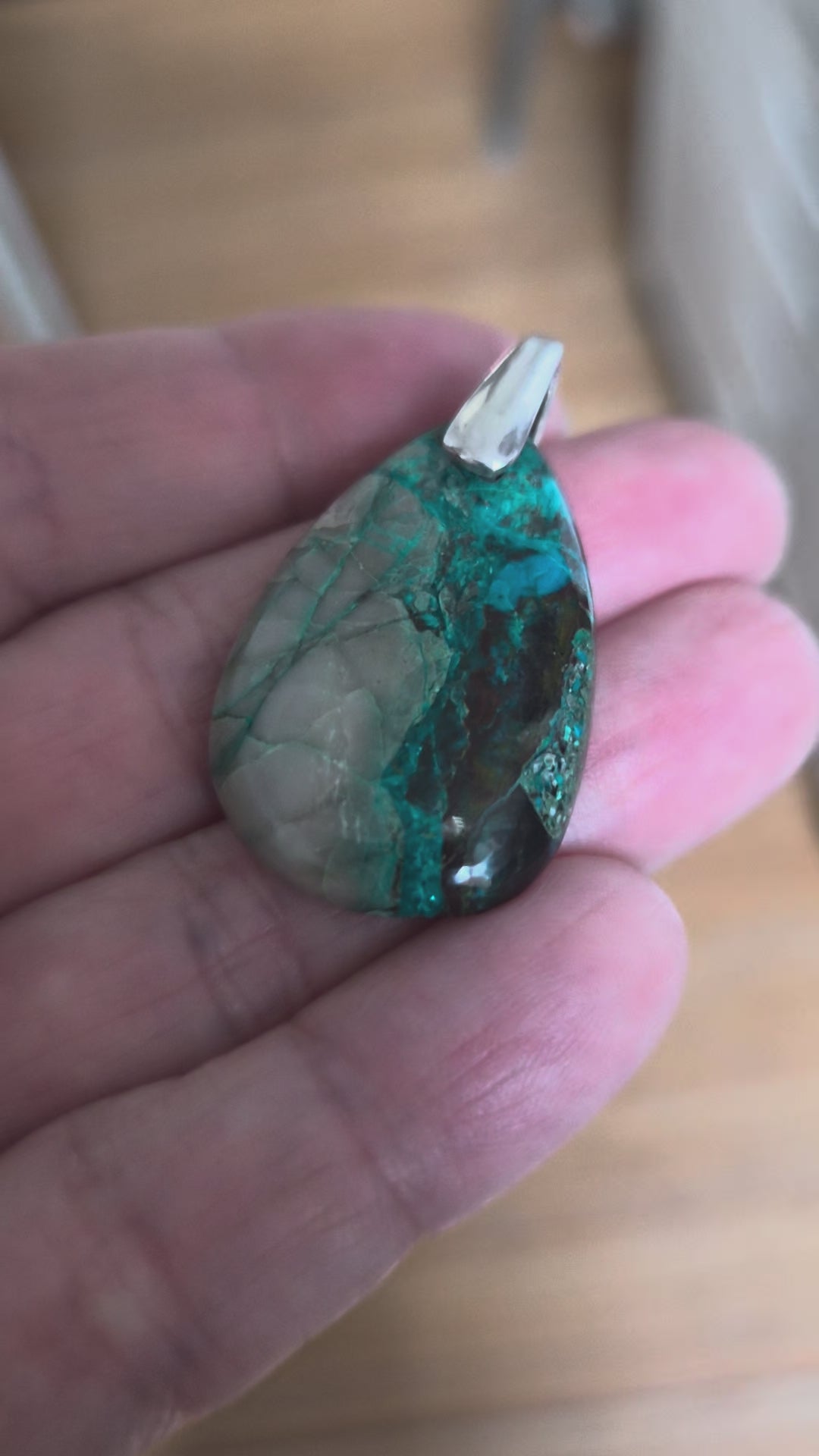 Découvrez un pendentif vibrant, alliance naturelle entre la Chrysocolle et la Shattuckite, deux pierres profondes aux nuances bleu turquoise, porteuses de douceur et de vérité intérieure.