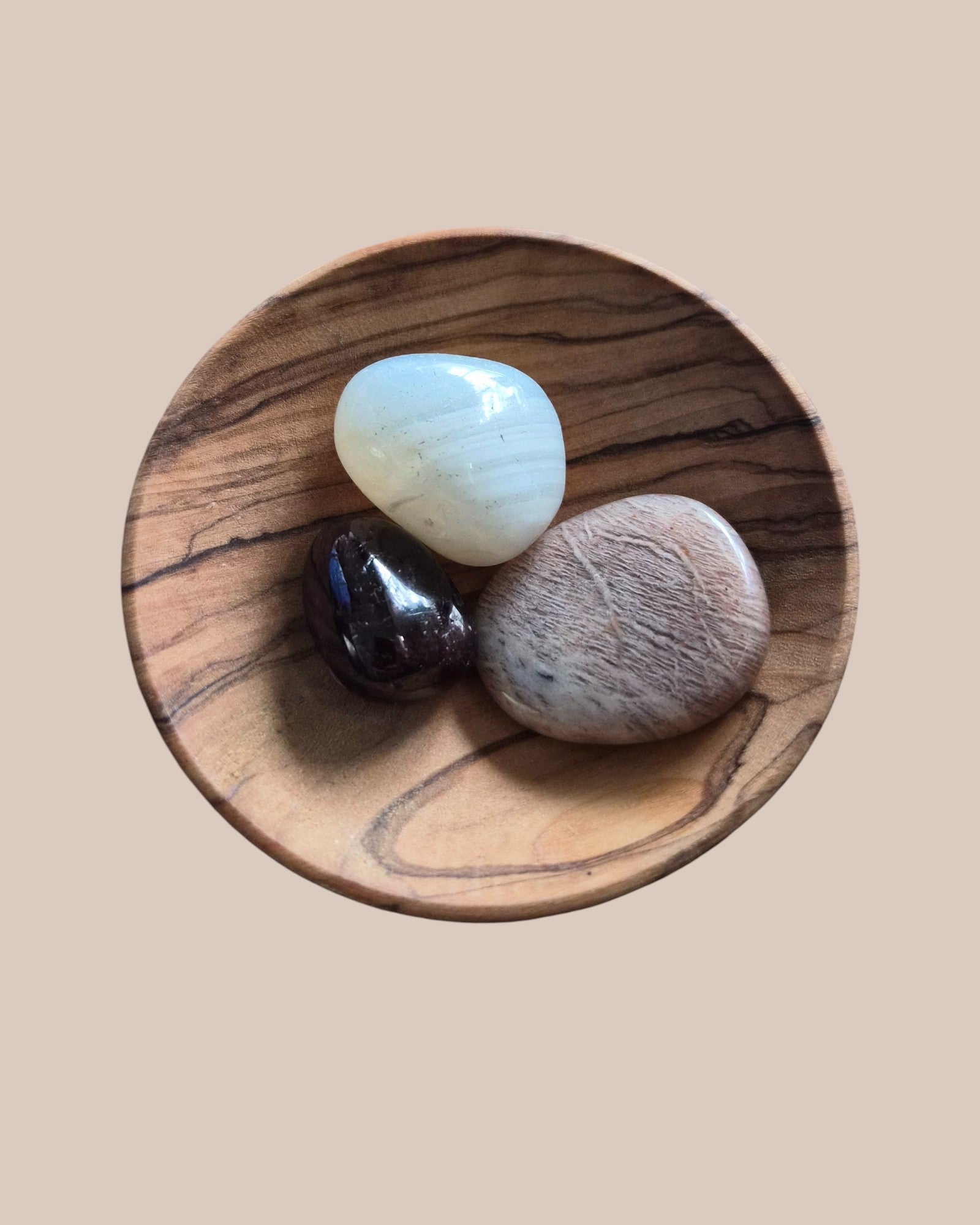 Pierre de lune : Pierre du féminin sacré et de l’énergie yin, elle accompagne tous les cycles de la femme. Elle soutient l’intuition, la douceur intérieure et l’équilibre émotionnel. Elle est particulièrement précieuse lors des périodes de transition comme la péri-pré-ménopause, la pré-ménopause et la ménopause, en aidant à se reconnecter au corps et à accueillir le changement avec plus de fluidité.